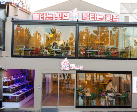 경포해수욕장 바로 앞에 위치한 '불타는횟집'은 바다를 바라보며 식사할 수 있는 오션뷰를 자랑합니다.