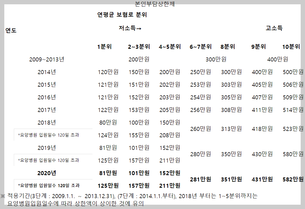 마지막으로, 건강보험료 본인 부담 상한제↗️에 대해 알아봅시다. 소득에 따라 본인 부담 상한금액이 다르며, 이를 초과하는 의료비에 대해서는 건강보험공단이 부담합니다. 따라서 본인의 소득 구간을 확인하는 것이 중요합니다. (※ 연도별 분위별 보험료구간 바로가기)