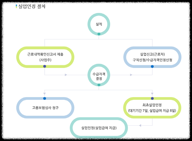 | 신청 방법 | 구직 등록, 실업 인정 신청, 구직 활동 보고, 실업급여 지급 |