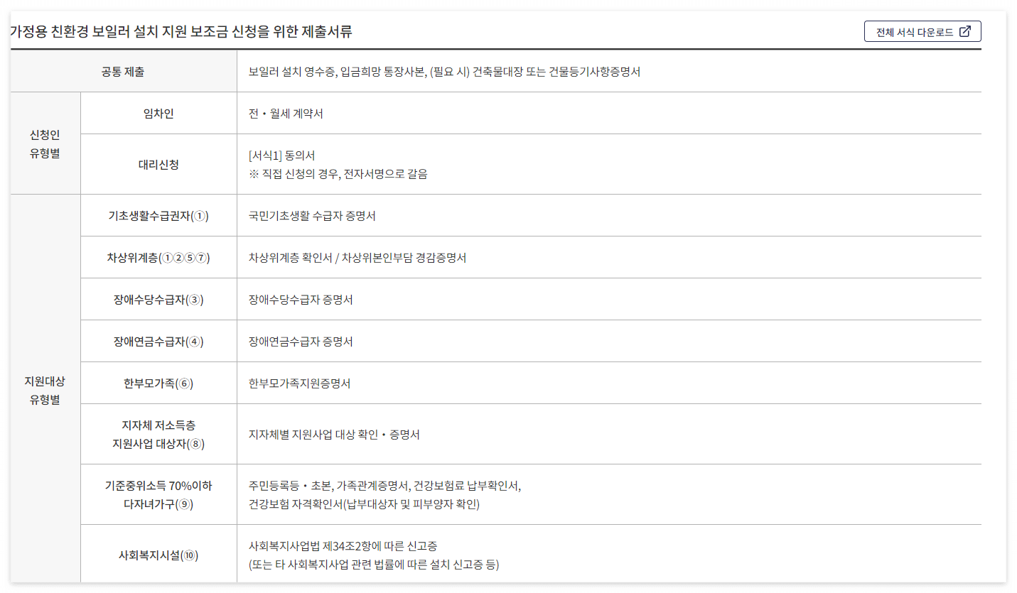 가정용 친환경 보일러 설치 지원 보조금 신청을 위한 제출서류