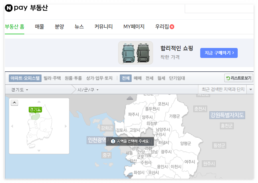 2. 관심 있는 매물 종류(아파트, 빌라, 원룸 등)와 지역을 선택합니다.