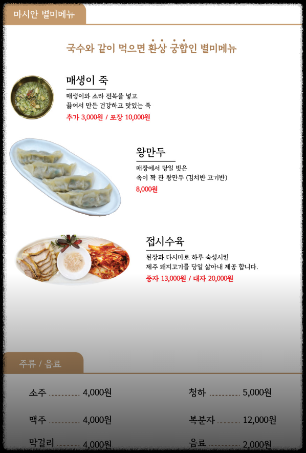 | 바지락칼국수 | 신선한 바지락이 듬뿍 들어간 시원한 국물의 칼국수 |