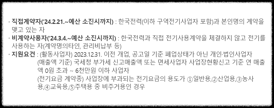 | 지원 방식 | 전기요금 고지서 차감 | 사업자 대표 계좌 환급 |