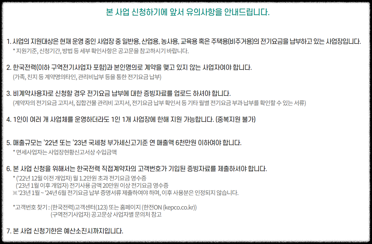 - 별도의 제출서류 없이 신청자 정보만 입력 (신청자명, 사업자등록번호, 사업장 주소지, 전기요금 고객번호 등)