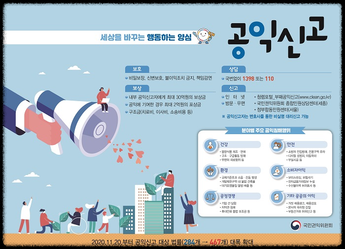 - 공무원이 부정한 행위를 한 경우 국민권익위원회에 신고할 수 있으며, 보상금은 공공기관의 이익 확대, 손실 방지 또는 공익증진에 따라 다르며 최대 30억원까지 받을 수 있습니다.