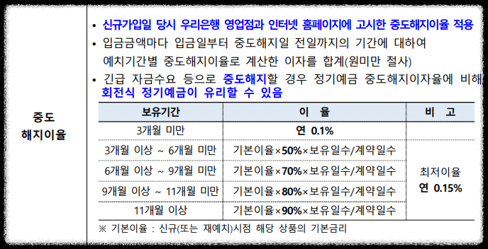 가입 후 중도해지를 할 경우, 해지 시점까지의 예치 기간에 따라 중도해지이율이 적용됩니다.