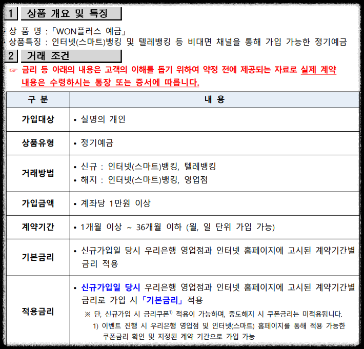 WON플러스 예금은 공동 명의로 가입할 수 없으며, 중도해지 시 약정된 이율보다 낮은 중도해지이율이 적용됩니다.