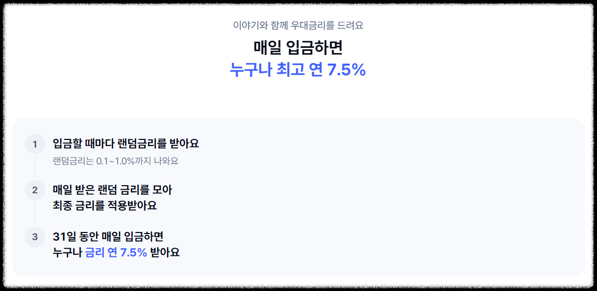 고객이 매일 입금하면서 이야기를 완성해 나가는 이 상품은, 최종적으로 연 7.5%의 최고 금리를 제공하여 효과적인 단기 자산 관리 수단이 됩니다.