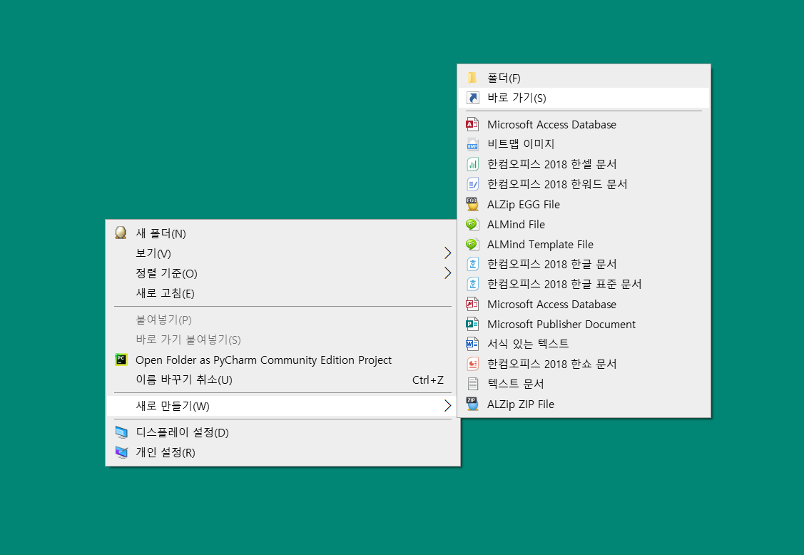 1. 바탕화면에서 우클릭(오른쪽 마우스) 한 후 새로 만들기를 클릭합니다.