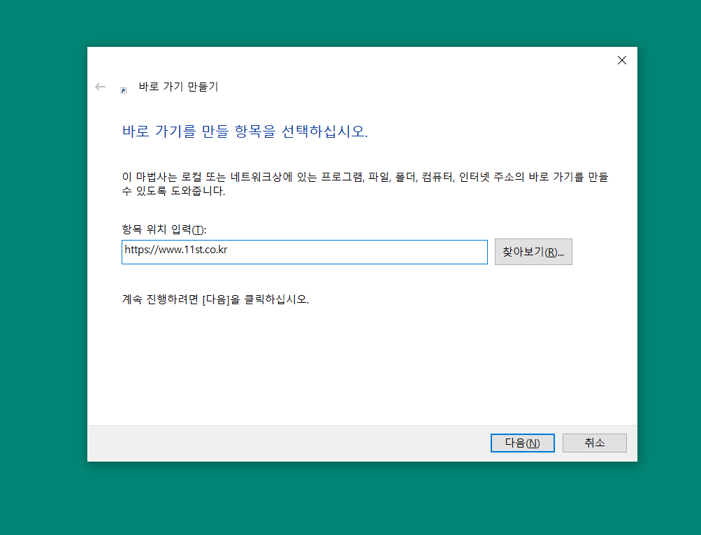 2. 바로가기를 클릭한 후 바로가기 만들기 창이 뜨면 https://www.11st.co.kr 주소를 입력합니다.