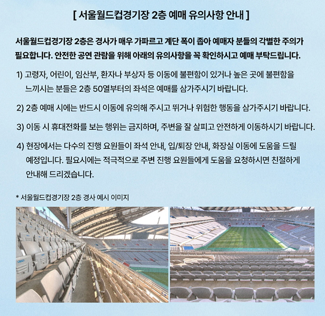 - 서울 월드컵경기장 2층은 경사가 가파르고 계단 폭이 좁아 이용에 주의가 필요합니다.